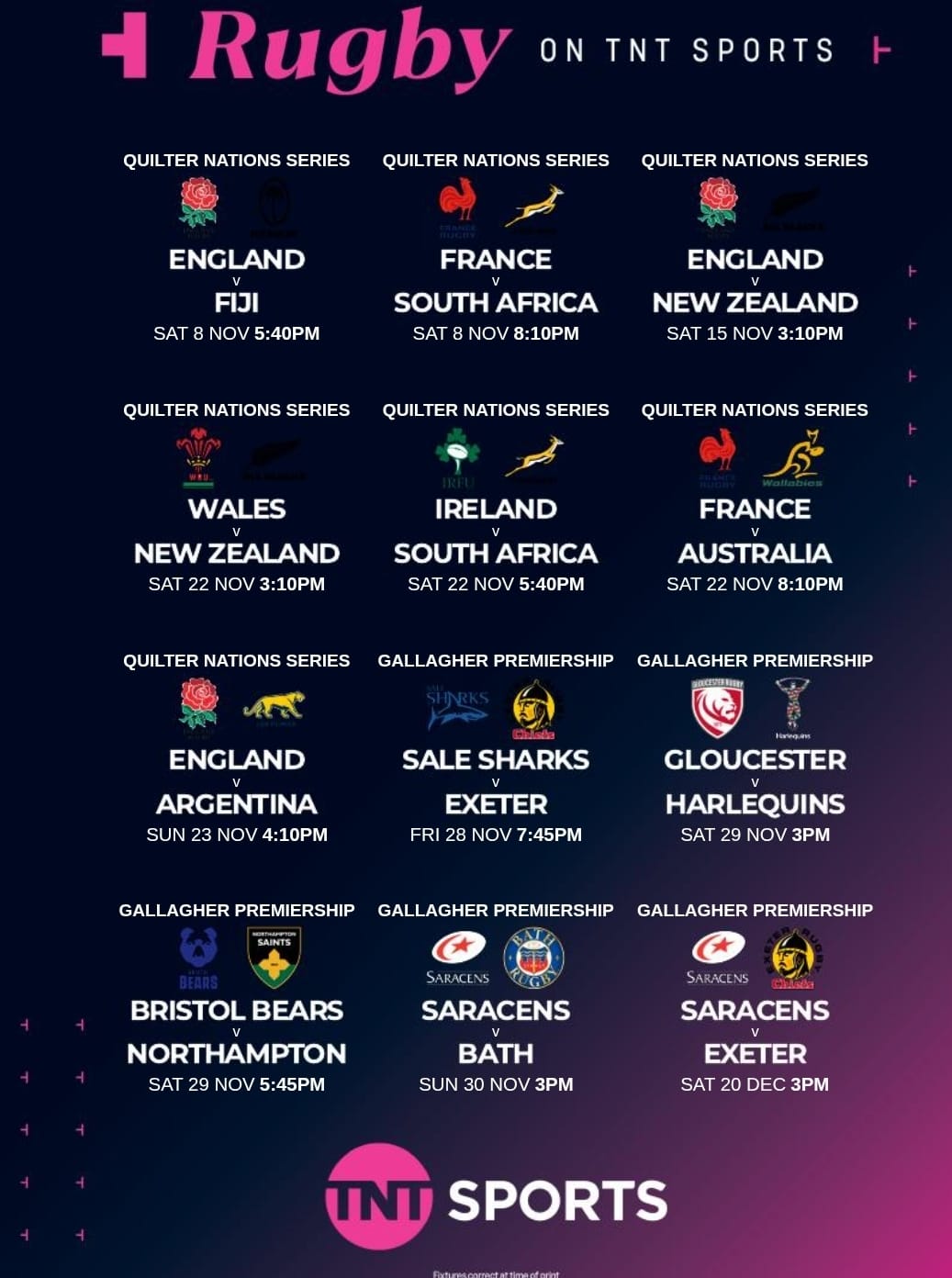 The George will be showing all [most!] Autumn Internationals Starting with Eng v Aus this Saturday. We have gone mad and have subscribed to TNT sport for a small fortune!!